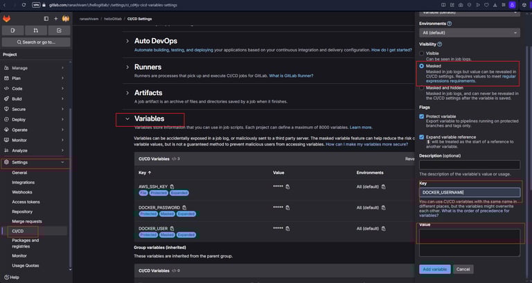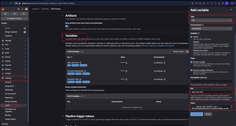 Goto the project repository, click on settings --> CI/CD --> Variables --> Add variables