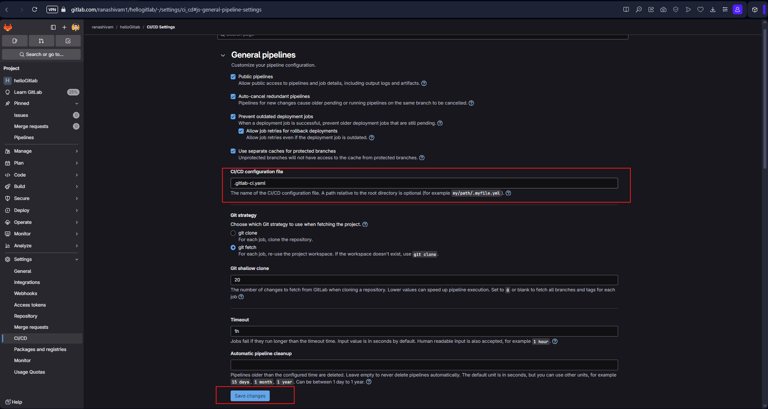 Add .gitlab-ci.yaml file to CI/CD configuration file and click on save changes.