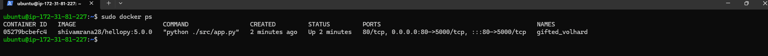 To check the successful deployment of docker image, run command = sudo docker ps (check image below)